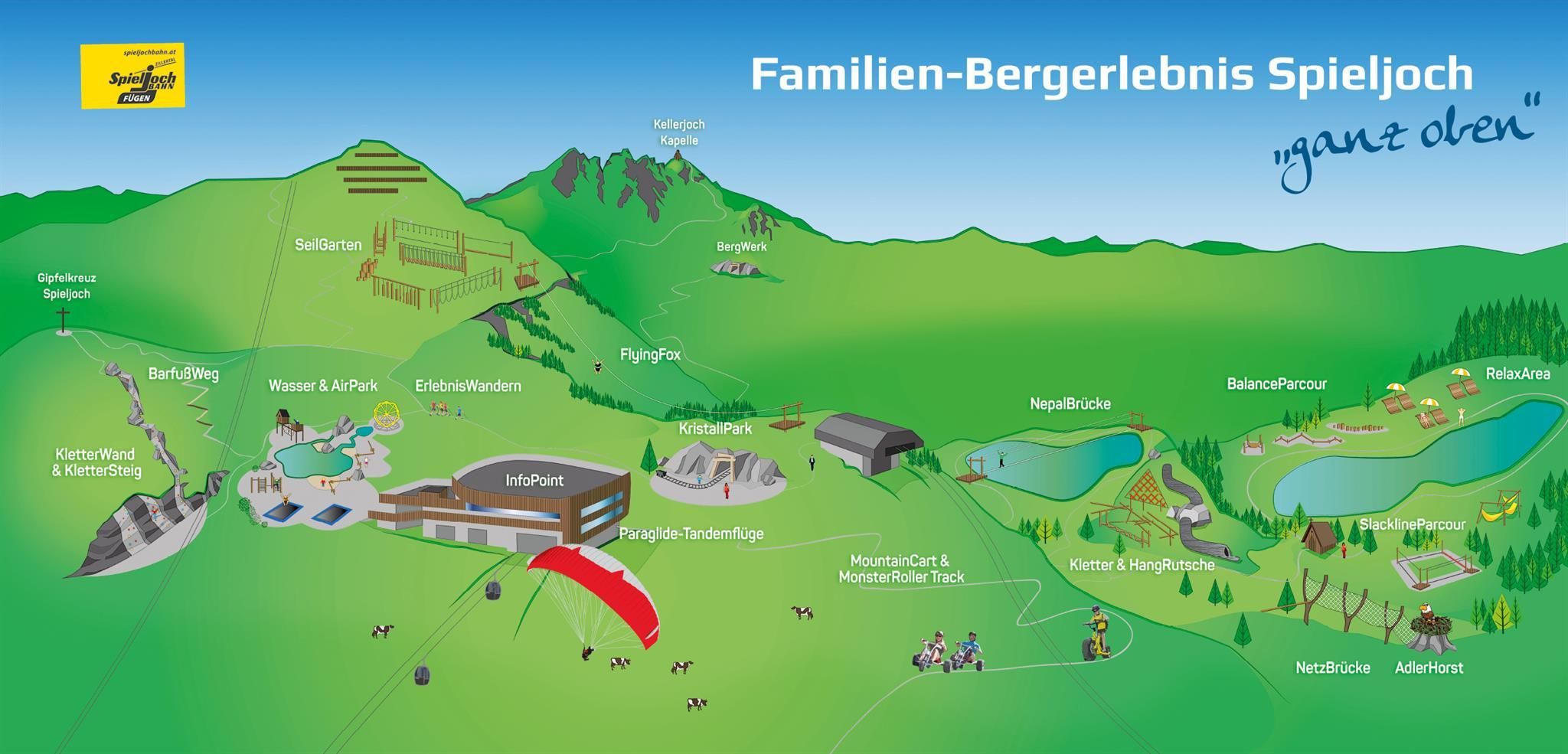 Nechte se s rodinou vyvézt supermoderní a bezbariérovou desetimístnou lanovkou z Fügenu na 1 858 metrů vysoký vrchol Spieljoch. Po výstupu na horu na vás čeká čerstvý horský vzduch a prvotřídní panorama. Od horní stanice až na 1 920 metrů vysoký vrchol se pro nejmenší otevírá skutečný svět dobrodružství uprostřed přírody: na celou rodinu čeká velký vodní park, vrcholová stezka pro bosé nohy, Flyingfox, monster koloběžky nebo horské káry, lanové centrum a mnoho dalšího! Podrobné informace najdete na www.spieljochbahn.at.