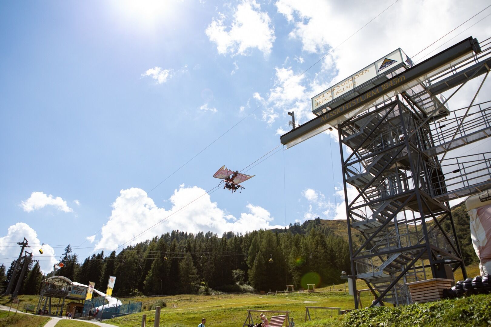 Ležet na břiše, vznášet se 47 metrů nad zemí a řítit se vzduchem plnou rychlostí: přesně to nabízí Fisser Flieger! Jako Superman nebo Wonder Woman se všichni návštěvníci s hlavou pro výšky vznášejí na obřím drakovi rychlostí 80 kilometrů v hodině přes pohoří Fiss. Šťastný dětský smích a uslzené oči k tomu patří. A kdo se chce do údolí vrátit trochu jinak, měl by naskočit na Fisser Flitzer. Dva a půl kilometru dlouhá jízda jeskyněmi, tunely nebo pirátskou lodí vás doveze na údolní nádraží ve Fiss.