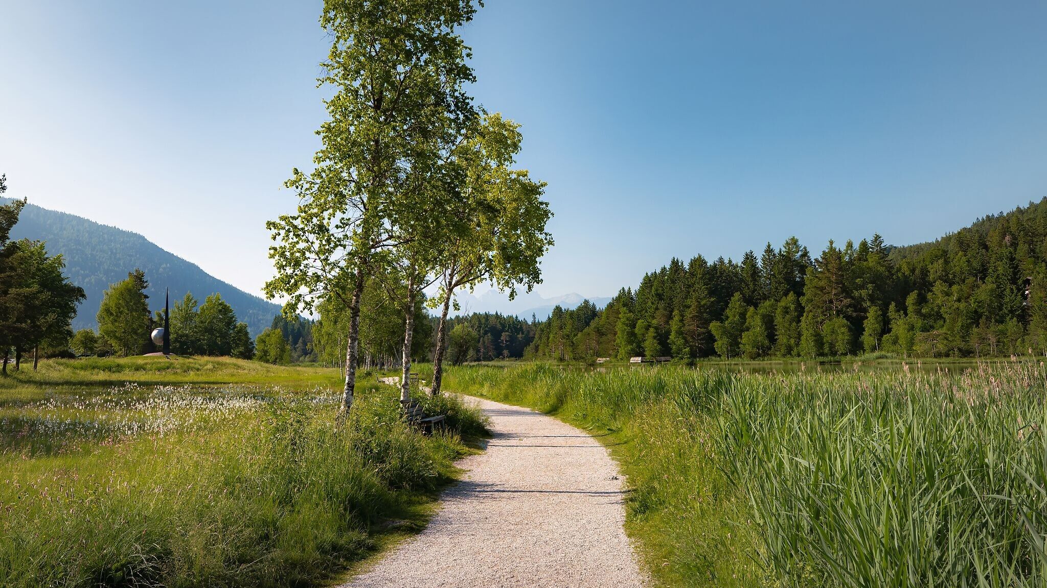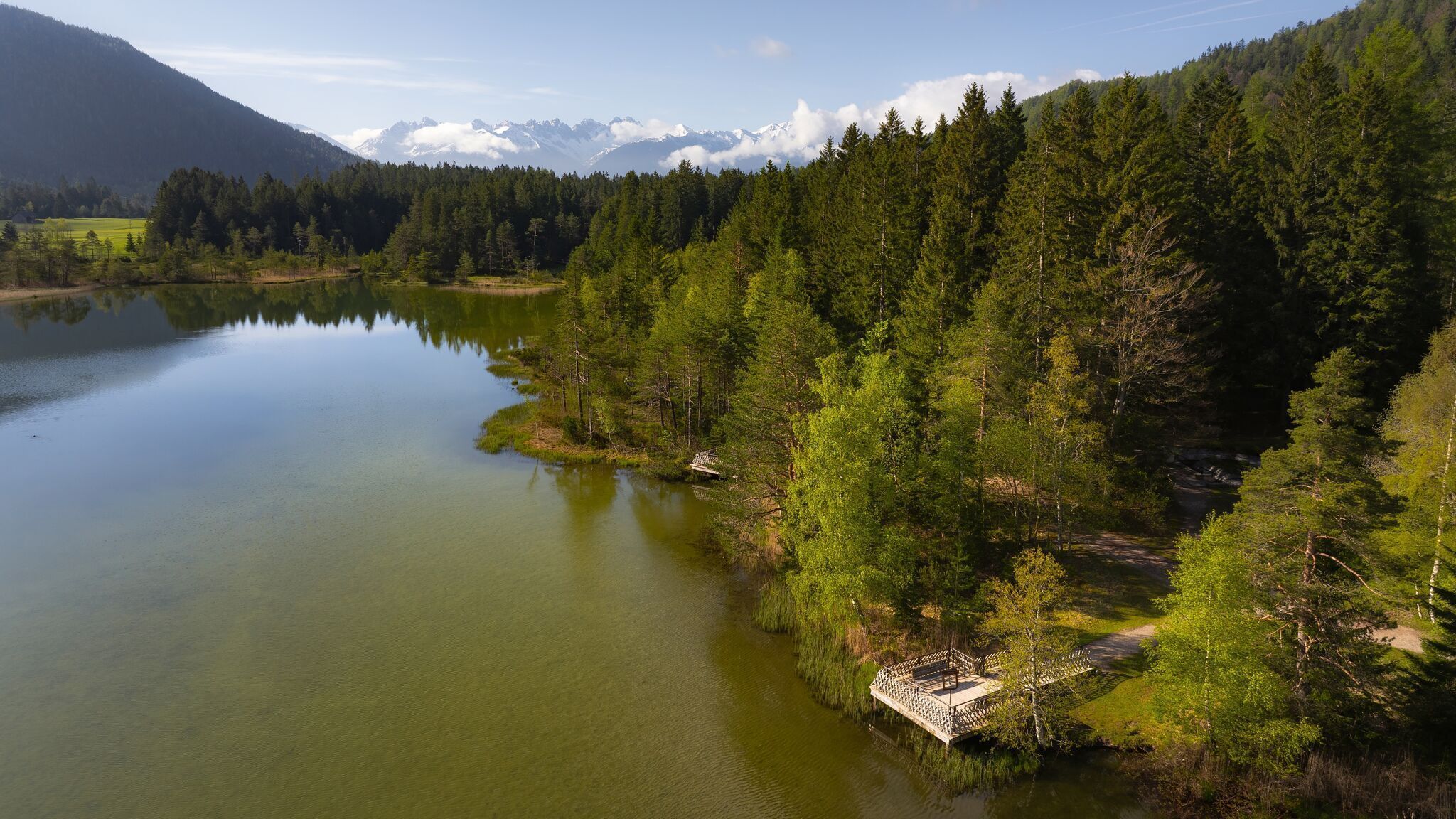 Trasa začíná na bezbariérovém nádraží v Seefeldu (je zde také bezbariérové WC a parkovací místa pro invalidy) a vede přímo historickou pěší zónou. Zde se často konají festivaly,trhy a spousta příjemných pohoštění, jako je káva nebo Aperol v jedné z mnoha zahrádek pro hosty. Až se ocitnete před farním kostelem svatého Osvalda, zahněte doleva směrem na jih a pomalu dojdete na konec pěší zóny. Pokračujte rovně přes přechod pro chodce a kolem hotelu Seespitz na snadno schůdnou štěrkovou cestu podél jezera Wildsee. Zde již můžete vidět první plavající kachny , zatímco dojedete na parkoviště. parkovištěParkoviště po levé straně. Případně, abyste si trasu trochu zkrátili, můžete zde zaparkovat auto a okruh kolem jezera začít odtud.