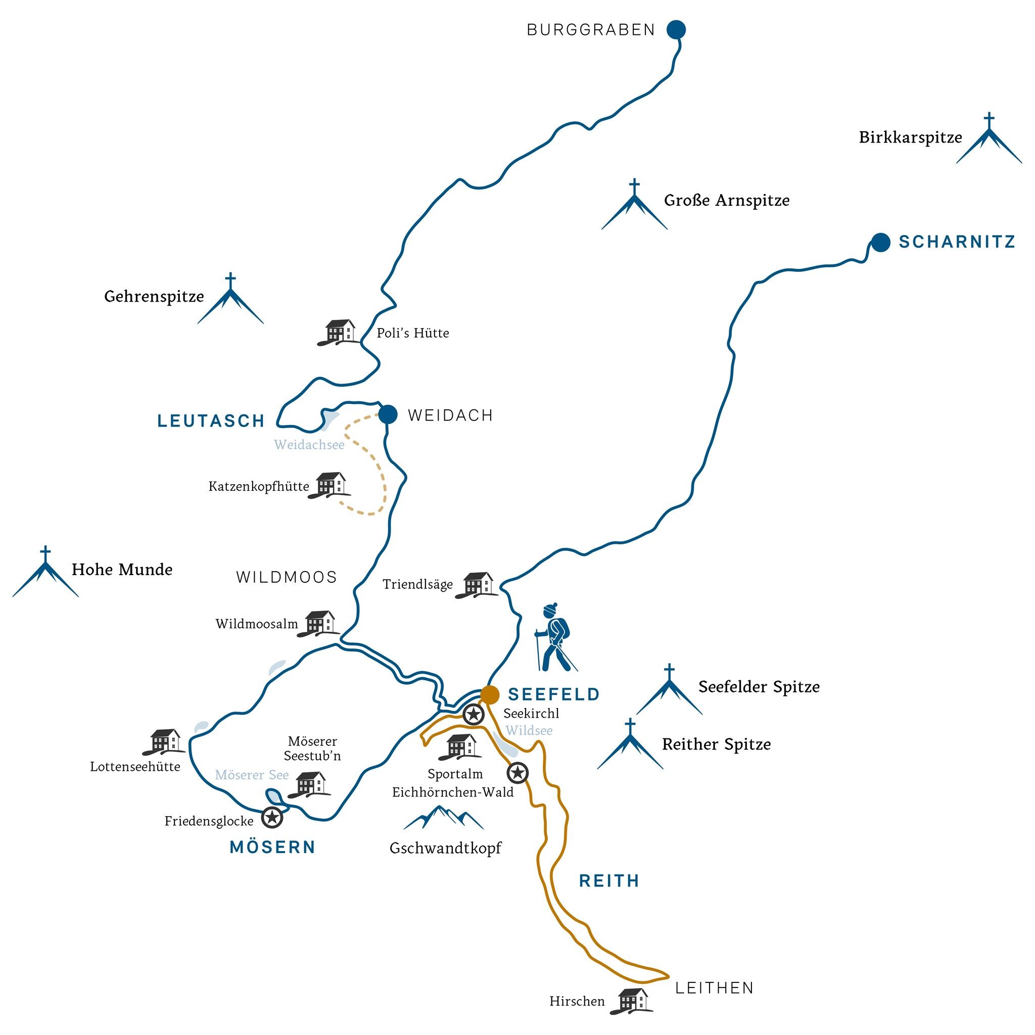 První etapa zimní dálkové túry na Seefeldskou náhorní plošinu začíná na nádraží v Seefeldu a vede po vyčištěných zimních turistických stezkách v délce asi 16,7 km rozmanitou zimní krajinou do Reithu a zpět do Seefeldu. Cestou se prochází kolem idylického jezera Wildsee, promenády u jezera a půvabných center vesnic, což dodává trase malebnost i kulturní atraktivitu. S mírným převýšením kolem 266 metrů je tato denní etapa ideální pro všechny, kdo hledají dlouhou, ale mírně namáhavou túru.