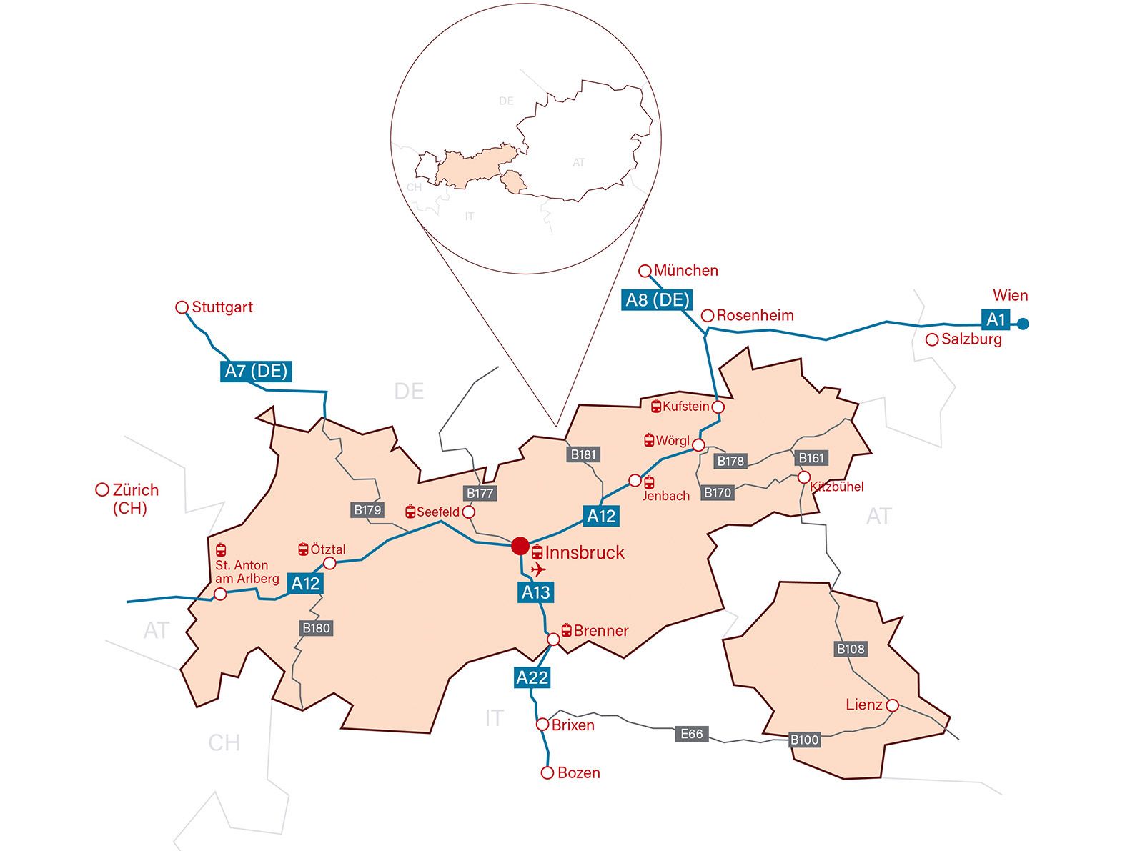 Ať už vlakem, autobusem, autem nebo letadlem, Tyrolsko je snadno dostupné a má vynikající napojení na veřejnou dopravu. Přímé i přestupní vlakové spoje umožňují pohodlnou a ekologickou cestu z mnoha měst. Místní veřejná doprava je zahrnuta ve většině karet pro hosty v regionech. Pro ty, kteří cestují autem nebo letadlem, je Tyrolsko snadno dostupné i těmito prostředky a nabízí přímá letecká spojení z mnoha evropských měst.